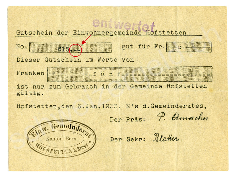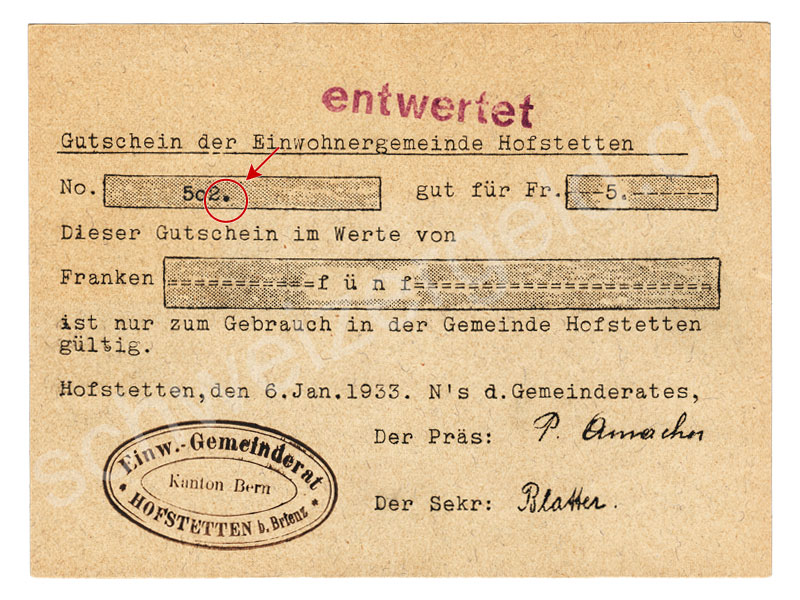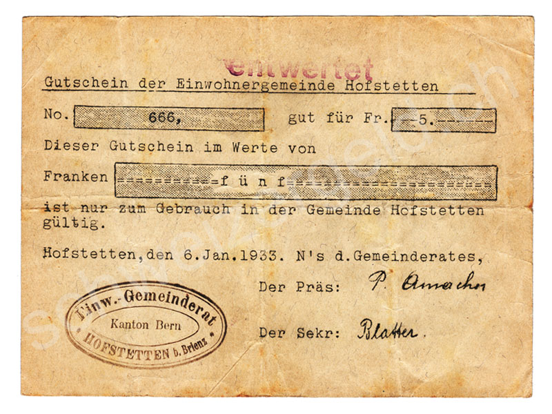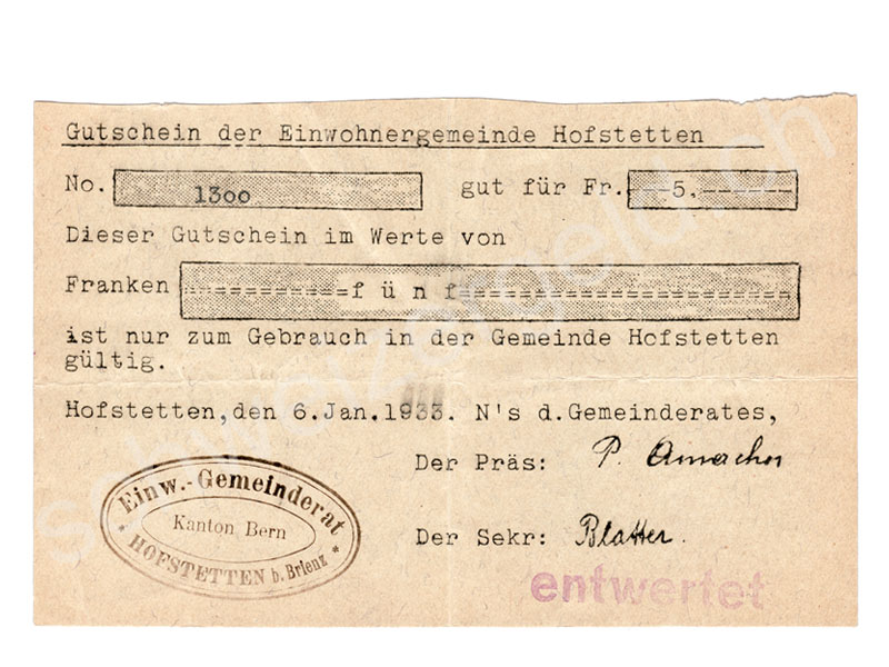 Banknoten, Aktien SNB: Notgeld Hofstetten, 5 Franken