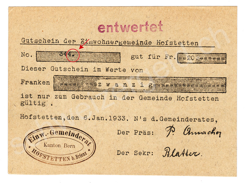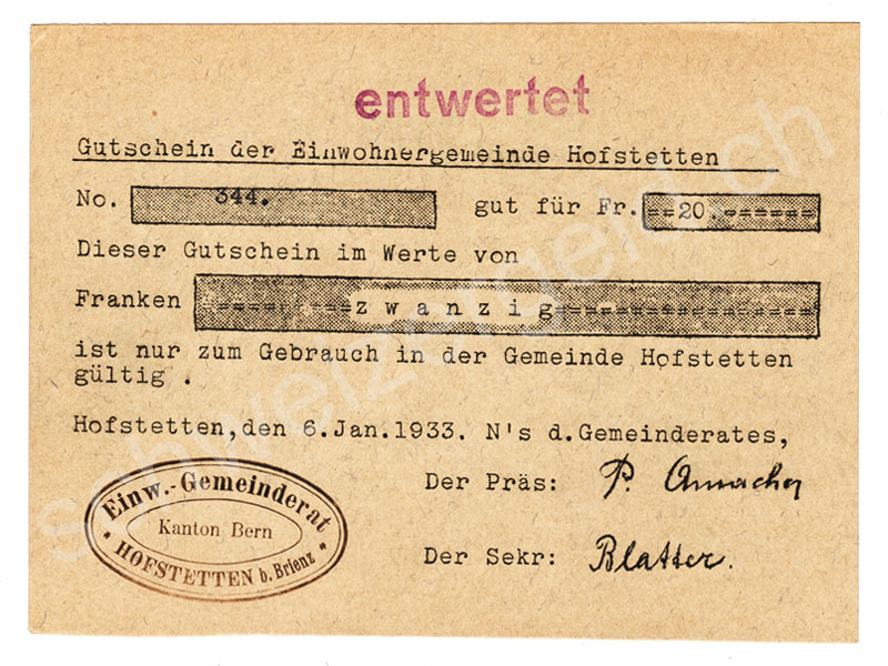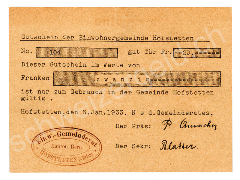 Banknoten, Aktien SNB: Notgeld Hofstetten, 20 Franken