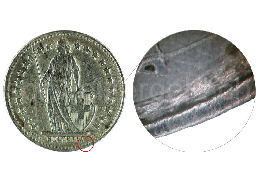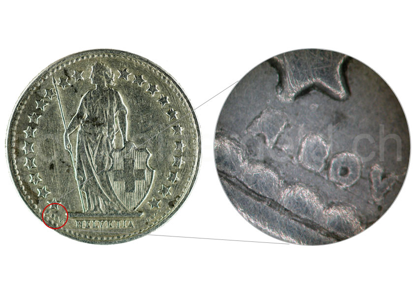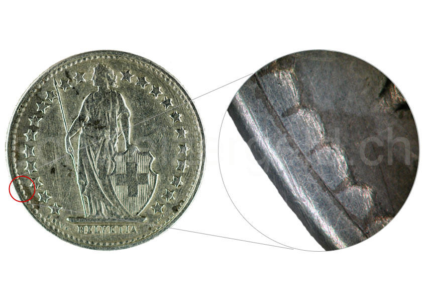 Identifiable due to ground in ring and due to missing minting error, minting error, all of which feature the 180 degrees rotation of 1946.